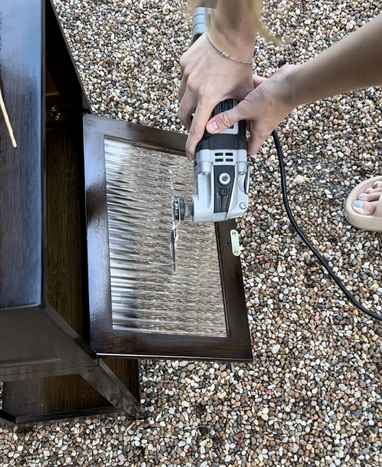 Thank goodness it’s not glass! I removed the plastic with a multi-tool like this one. If you don’t have one and aren’t ready to invest— don’t fret! Remove the plastic however you can. Use an axe for all I care (just be careful to not damage the door, wood, or yourself)!