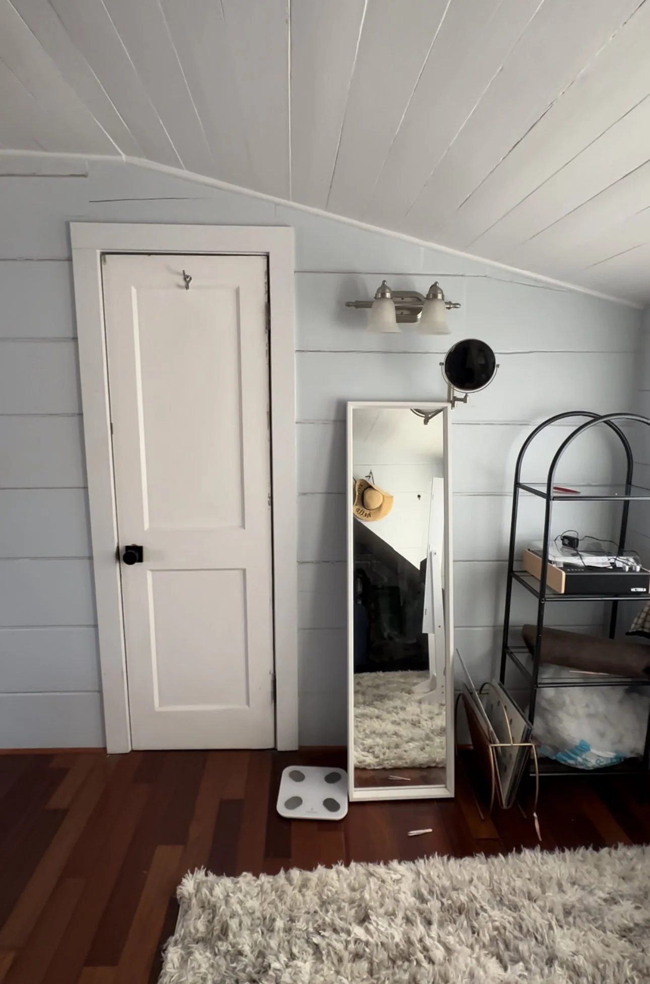 Now, I started adding furniture and decor. I purchased this standing jewelry mirror months ago, and it worked perfectly in this closet.