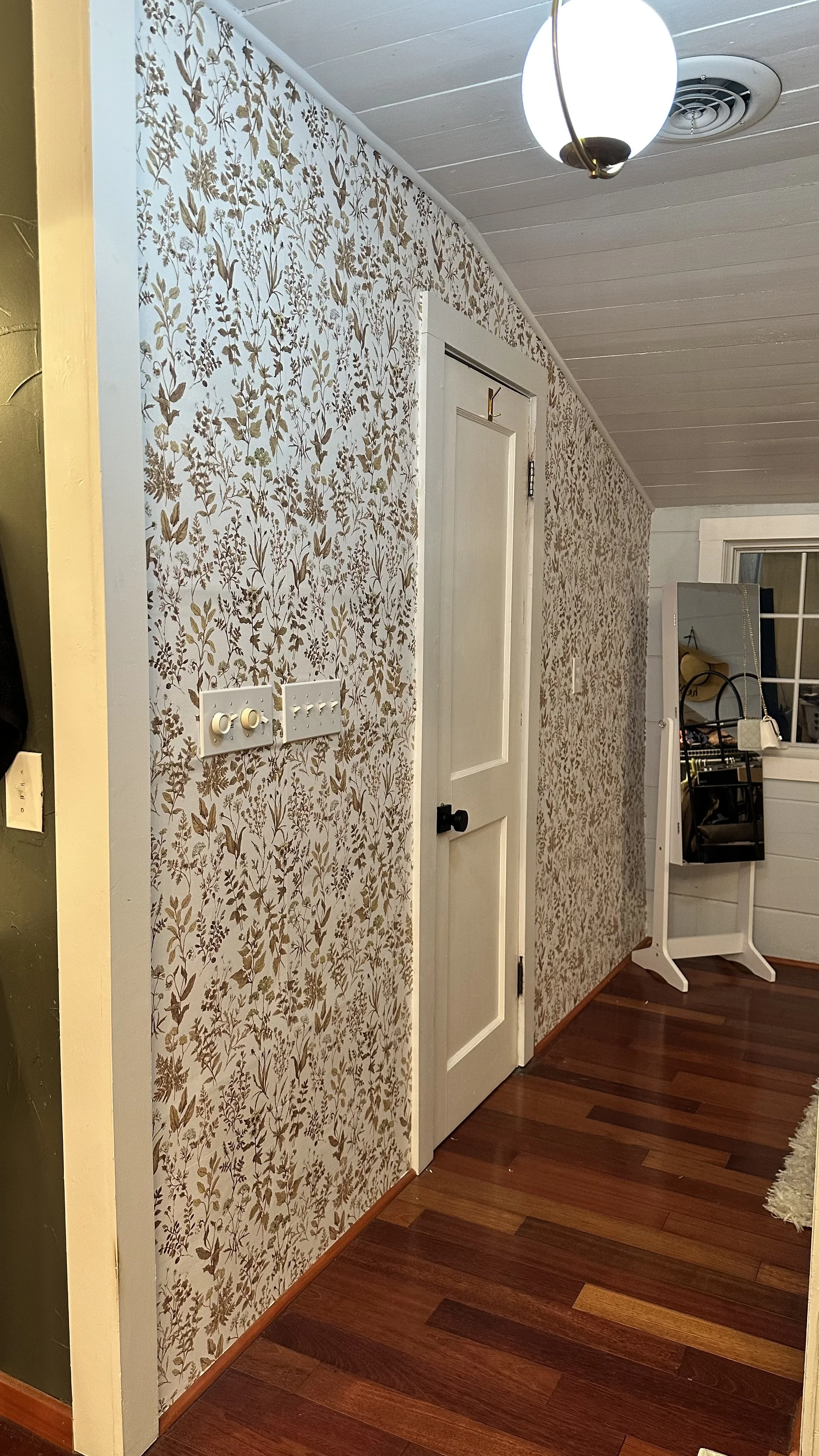 My first project was simple— make this wall look fancy. It’s the view from my bed, and it’s the first thing you see when you walk upstairs to our bedroom. It was blue wood planks, so I installed this peel and stick wallpaper for a pop of gold and depth. If you use this brand, I’d recommend overlapping by a few centimeters as it will shrink after install. Mine hasn’t peeled off at all.