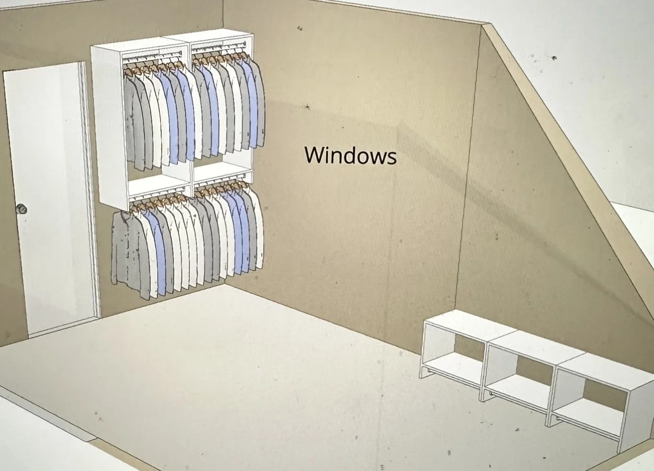 Two things you should know about me— I’m one of the cheapest people you’ll ever meet… and I have a WEIRD closet in my bedroom. It’s half a-frame, has windows, a low ceiling, and nearly zero storage. After doing some research, I found out custom closets start at around $3,000 for a closet my size. One designer service was going to cost around $20K. Every single thing I ordered came from Amazon. Here’s a link to the list of every single thing I used.