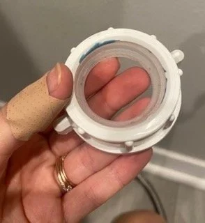 11. Get back up. Grab the new drain part from the box. Take off the plastic cap. LEAVE the white and plastic/clear pieces at the top. Screw off the bottom parts.